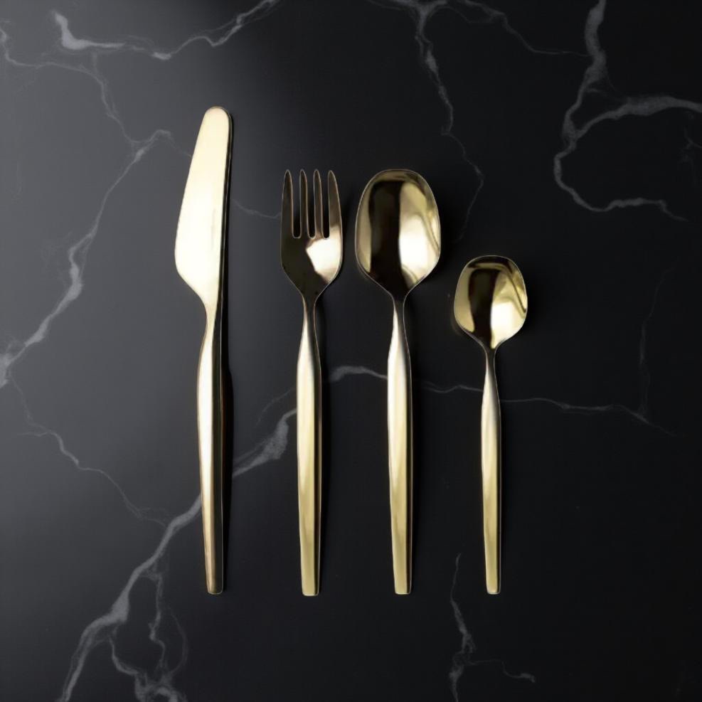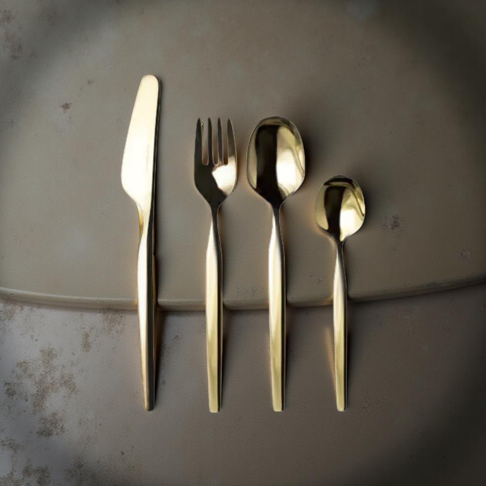 Jedes Abendessen verdient ein schönes Besteck, auch wenn es ganz ohne Gesellschaft stattfindet. Dieses moderne, goldene Besteck-Set besteht aus einer Gabel, einem Messer, einem Löffel und einem Dessertlöffel.